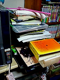 この山で困るのは、使いたい資料が底辺にきてる時。山を崩さないように取らないと、土砂災害が起こります(笑)